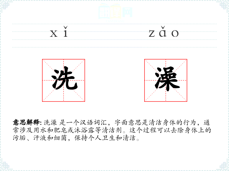 洗澡 是一个汉语词汇,字面意思是清洁身体的行为,通常涉及用水和肥皂或沐浴露等清洁剂。这个过程可以去除身体上的污垢、汗液和细菌,保持个人卫生和清洁。
