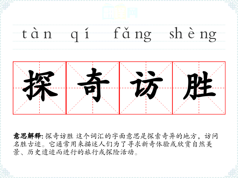 探奇访胜 这个词汇的字面意思是探索奇异的地方,访问名胜古迹。它通常用来描述人们为了寻求新奇体验或欣赏自然美景、历史遗迹而进行的旅行或探险活动。