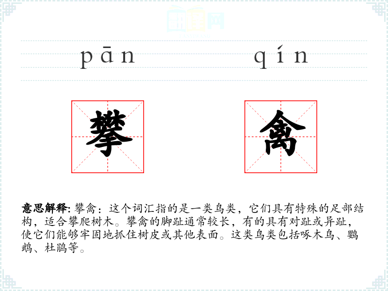 “攀禽”这个词源于对鸟类行为和生理特征的描述。在中文里,“攀”指的是攀爬,而“禽”指的是鸟类。这个词没有复杂的词源故事,主要是基于对鸟类行为的直接描述。