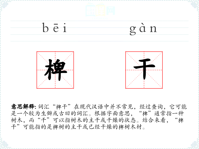 - 理解:椑干是一个具有特定文化背景和历史意义的词汇,虽然在现代汉语中不常见,但在学习和研究古代文化时具有一定的价值。