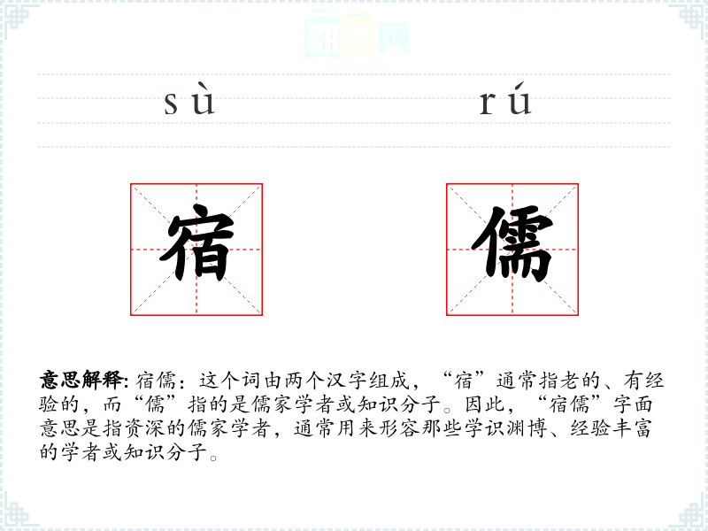 宿儒:这个词由两个汉字组成,“宿”通常指老的、有经验的,而“儒”指的是儒家学者或知识分子。因此,“宿儒”字面意思是指资深的儒家学者,通常用来形容那些学识渊博、经验丰富的学者或知识分子。