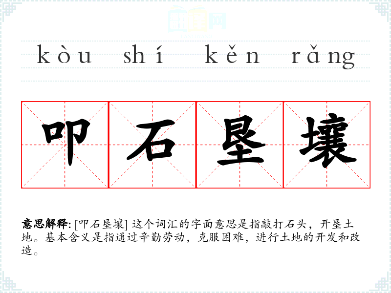 [叩石垦壤] 这个词汇的字面意思是指敲打石头,开垦土地。基本含义是指通过辛勤劳动,克服困难,进行土地的开发和改造。