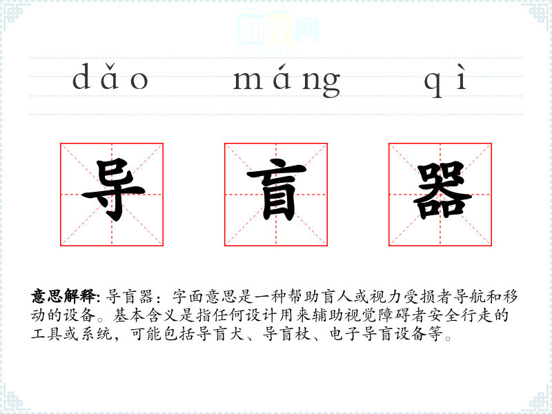 导盲器:字面意思是一种帮助盲人或视力受损者导航和移动的设备。基本含义是指任何设计用来辅助视觉障碍者安全行走的工具或系统,可能包括导盲犬、导盲杖、电子导盲设备等。