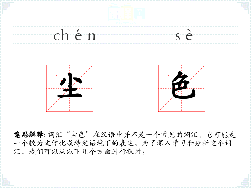 词汇“尘色”在汉语中并不是一个常见的词汇,它可能是一个较为文学化或特定语境下的表达。为了深入学*和分析这个词汇,我们可以从以下几个方面进行探讨: