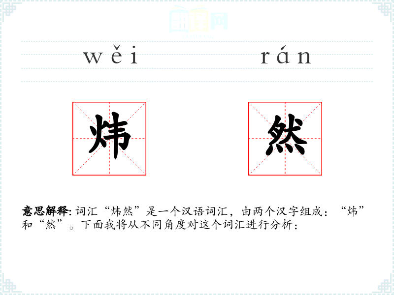 词汇“炜然”是一个汉语词汇,由两个汉字组成:“炜”和“然”。下面我将从不同角度对这个词汇进行分析: