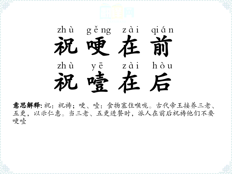 祝:祝祷;哽、噎:食物塞住喉咙。古代帝王接养三老、五更,以示仁惠。当三老、五更进餐时,派人在前后祝祷他们不要哽噎