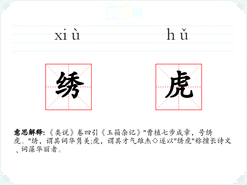 ,号绣虎。"绣,谓其词华隽美;虎,谓其才气雄杰◇遂以"绣虎"称擅长诗文﹑词藻华丽者。