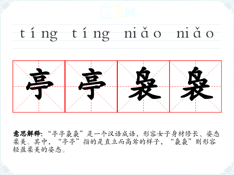 “亭亭袅袅”是一个汉语成语,形容女子身材修长、姿态柔美。其中,“亭亭”指的是直立而高耸的样子,“袅袅”则形容轻盈柔美的姿态。