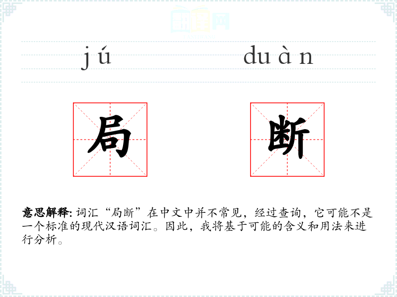 词汇“局断”在中文中并不常见,经过查询,它可能不是一个标准的现代汉语词汇。因此,我将基于可能的含义和用法来进行分析。