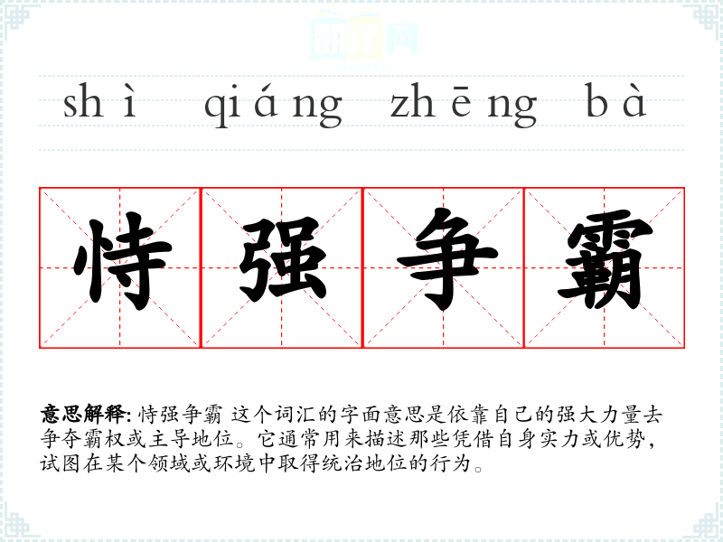 恃强争霸 这个词汇的字面意思是依靠自己的强大力量去争夺霸权或主导地位。它通常用来描述那些凭借自身实力或优势,试图在某个领域或环境中取得统治地位的行为。