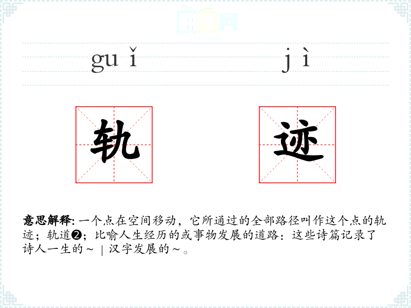 一个点在空间移动,它所通过的全部路径叫作这个点的轨迹;轨道➋;比喻人生经历的或事物发展的道路:这些诗篇记录了诗人一生的~|汉字发展的~。