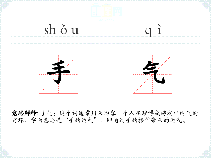 手气:这个词通常用来形容一个人在赌博或游戏中运气的好坏。字面意思是“手的运气”,即通过手的操作带来的运气。