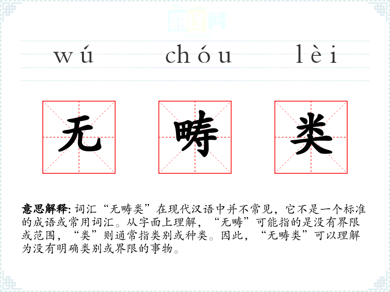 词汇“无畴类”在现代汉语中并不常见,它不是一个标准的成语或常用词汇。从字面上理解,“无畴”可能指的是没有界限或范围,“类”则通常指类别或种类。因此,“无畴类”可以理解为没有明确类别或界限的事物。