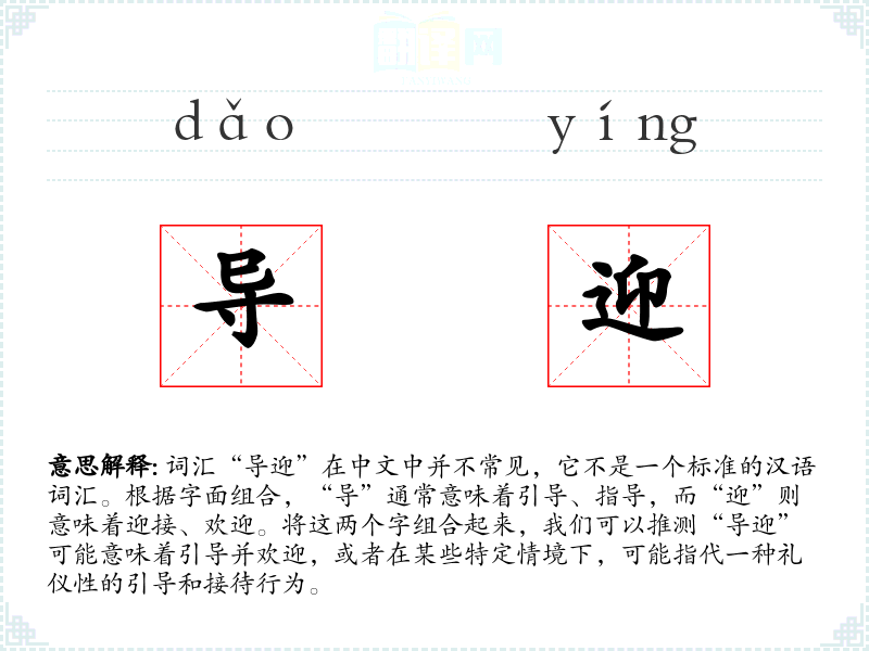 词汇“导迎”在中文中并不常见,它不是一个标准的汉语词汇。根据字面组合,“导”通常意味着引导、指导,而“迎”则意味着迎接、欢迎。将这两个字组合起来,我们可以推测“导迎”可能意味着引导并欢迎,或者在某些特定情境下,可能指代一种礼仪性的引导和接待行为。