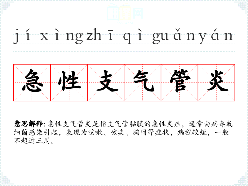 “急性”源自拉丁语“acutus”,意为尖锐的、急性的;“支气管炎”源自希腊语“bronchos”(支气管)和“itis”(炎症)。这个词在19世纪末被引入英语,用于描述这种特定的医学状况。