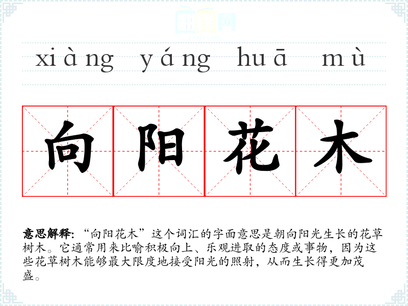 “向阳花木”这个词汇的字面意思是朝向阳光生长的花草树木。它通常用来比喻积极向上、乐观进取的态度或事物,因为这些花草树木能够最大限度地接受阳光的照射,从而生长得更加茂盛。
