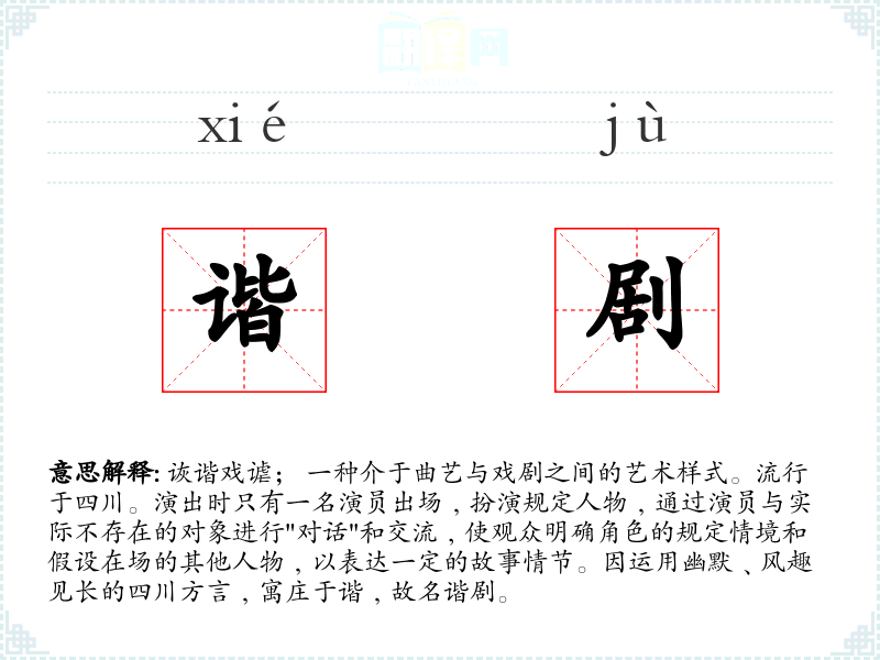 1.诙谐戏谑; 一种介于曲艺与戏剧之间的艺术样式。流行于四川。演出时只有一名演员出场﹐扮演规定人物﹐通过演员与实际不存在的对象进行"对话"和交流﹐使观众明确角色的规定情境和假设在场的其他人物﹐以表达一定的故事情节。因运用幽默﹑风趣见长的四川方言﹐寓庄于谐﹐故名谐剧。
