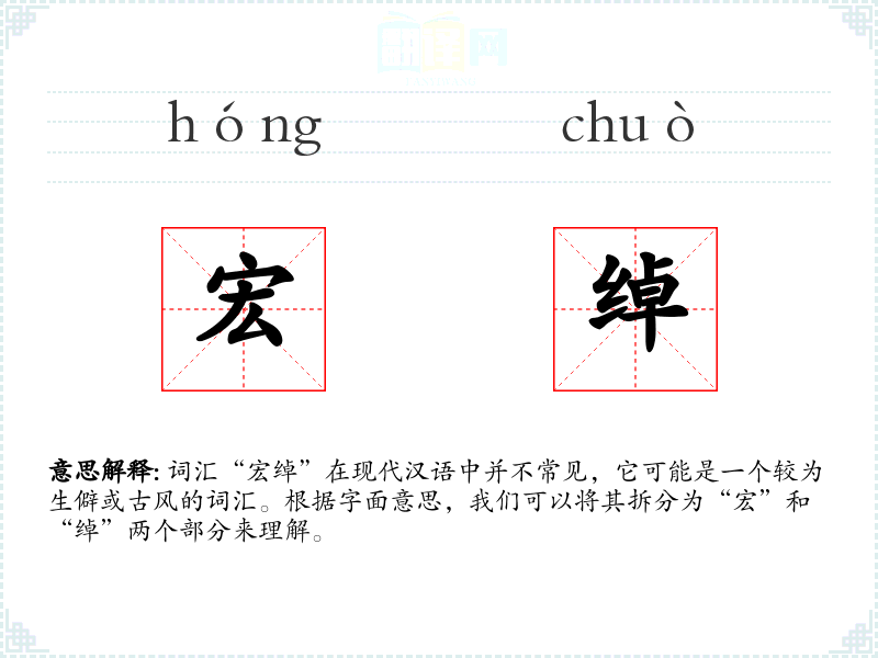 词汇“宏绰”在现代汉语中并不常见,它可能是一个较为生僻或古风的词汇。根据字面意思,我们可以将其拆分为“宏”和“绰”两个部分来理解。
