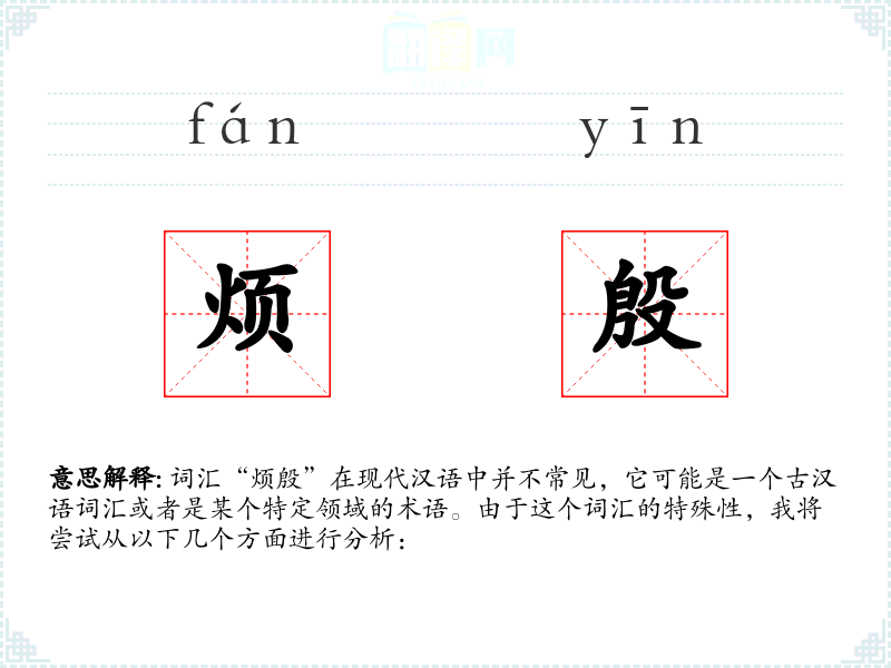 词汇“烦殷”在现代汉语中并不常见,它可能是一个古汉语词汇或者是某个特定领域的术语。由于这个词汇的特殊性,我将尝试从以下几个方面进行分析: