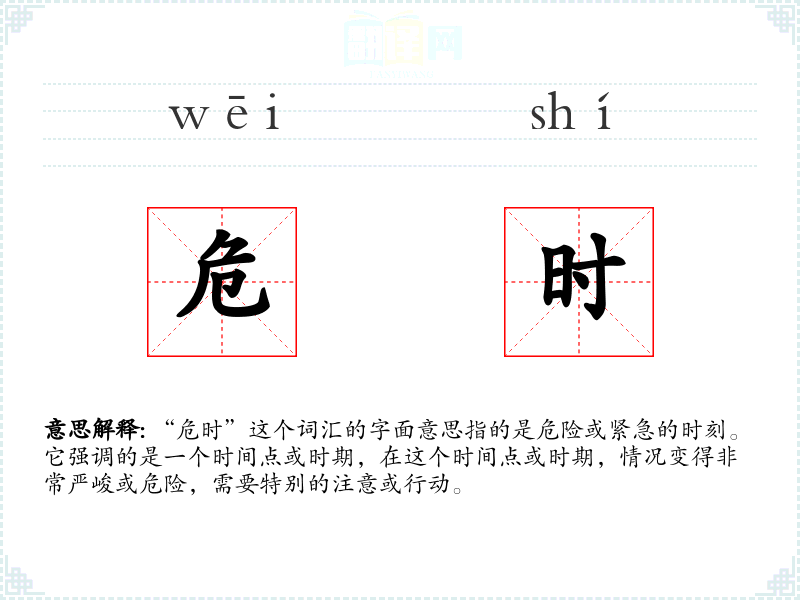 “危时”这个词汇的字面意思指的是危险或紧急的时刻。它强调的是一个时间点或时期,在这个时间点或时期,情况变得非常严峻或危险,需要特别的注意或行动。