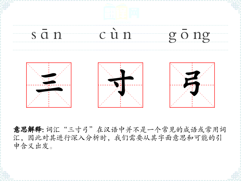词汇“三寸弓”在汉语中并不是一个常见的成语或常用词汇,因此对其进行深入分析时,我们需要从其字面意思和可能的引申含义出发。
