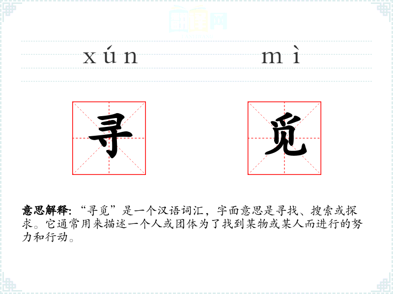 “寻觅”是一个汉语词汇,字面意思是寻找、搜索或探求。它通常用来描述一个人或团体为了找到某物或某人而进行的努力和行动。