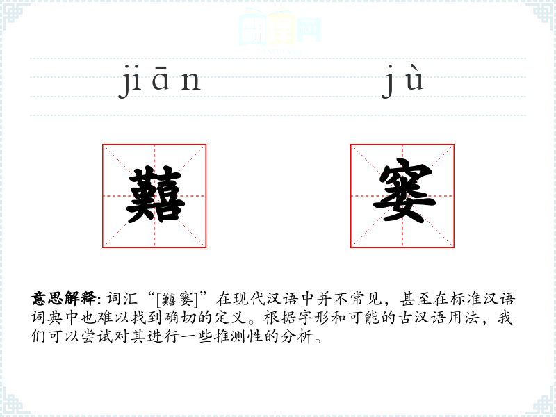 词汇“[囏窭]”在现代汉语中并不常见,甚至在标准汉语词典中也难以找到确切的定义。根据字形和可能的古汉语用法,我们可以尝试对其进行一些推测性的分析。