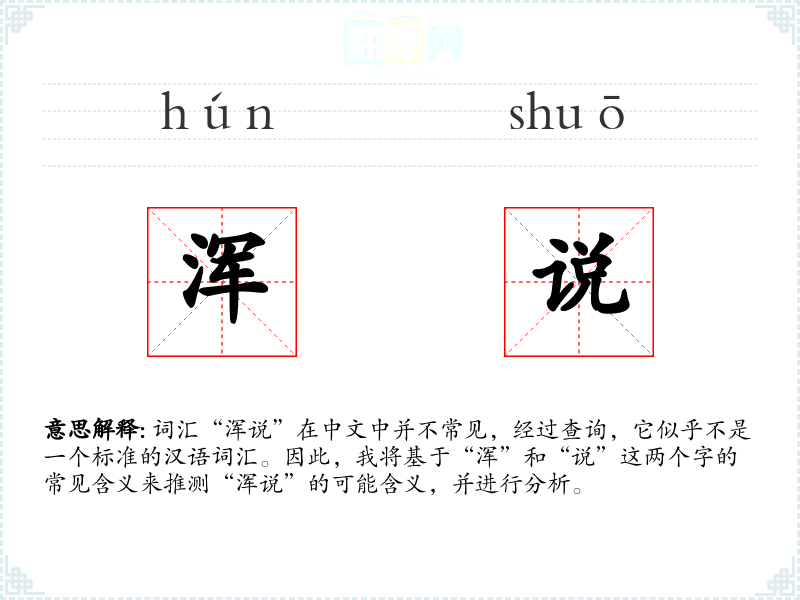 由于“浑说”不是一个常用词汇,其词源和演变难以考证。但“浑”字在古代汉语中已有混浊、不清晰的意思,而“说”字则一直指说话或表达。
