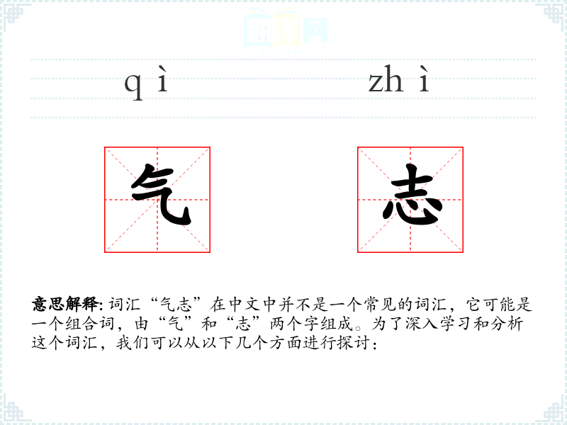 词汇“气志”在中文中并不是一个常见的词汇,它可能是一个组合词,由“气”和“志”两个字组成。为了深入学*和分析这个词汇,我们可以从以下几个方面进行探讨: