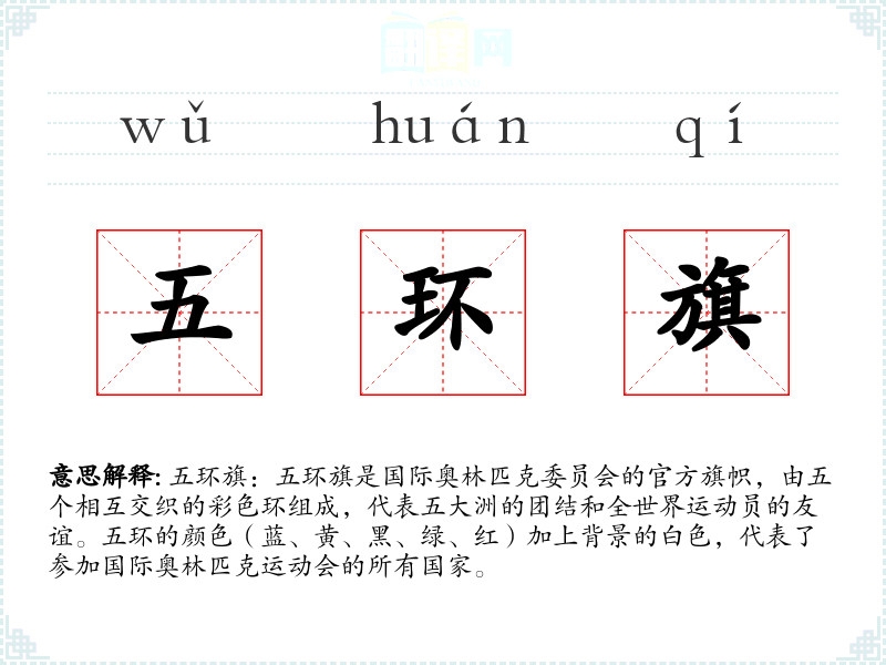 - 同义词:奥林匹克旗、奥运旗(都指同一旗帜,但“五环旗”更强调其图案特征)