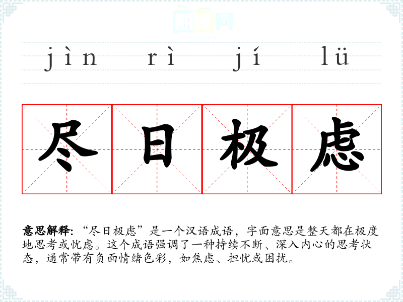 “尽日极虑”是一个汉语成语,字面意思是整天都在极度地思考或忧虑。这个成语强调了一种持续不断、深入内心的思考状态,通常带有负面情绪色彩,如焦虑、担忧或困扰。