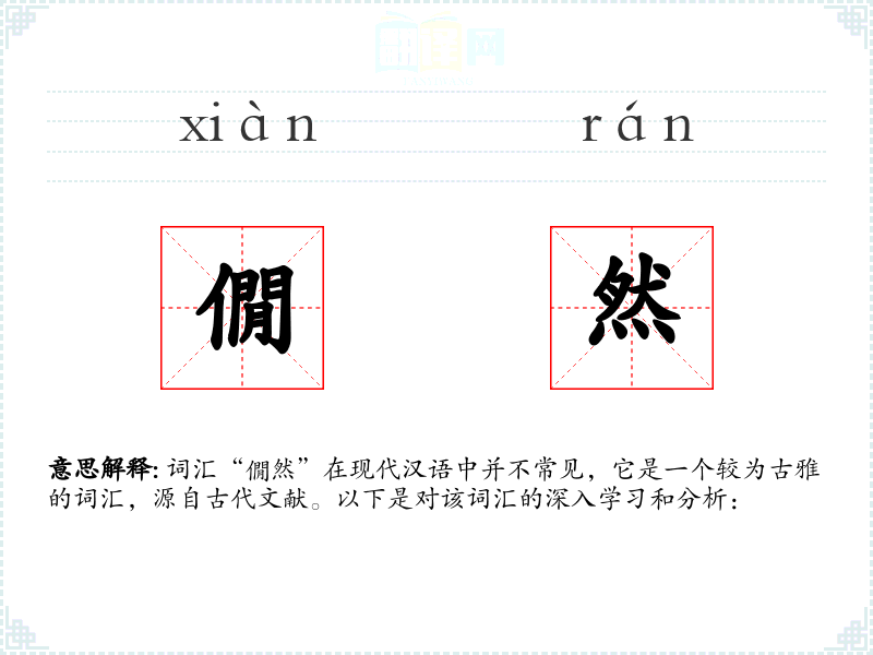 词汇“僩然”在现代汉语中并不常见,它是一个较为古雅的词汇,源自古代文献。以下是对该词汇的深入学*和分析: