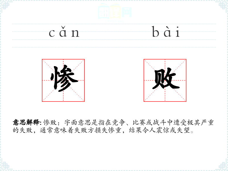 惨败:字面意思是指在竞争、比赛或战斗中遭受极其严重的失败,通常意味着失败方损失惨重,结果令人震惊或失望。