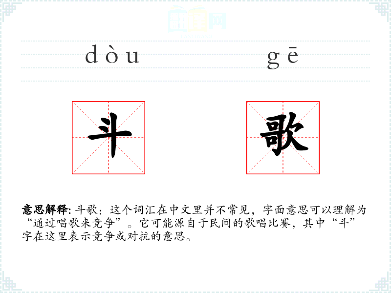 斗歌:这个词汇在中文里并不常见,字面意思可以理解为“通过唱歌来竞争”。它可能源自于民间的歌唱比赛,其中“斗”字在这里表示竞争或对抗的意思。