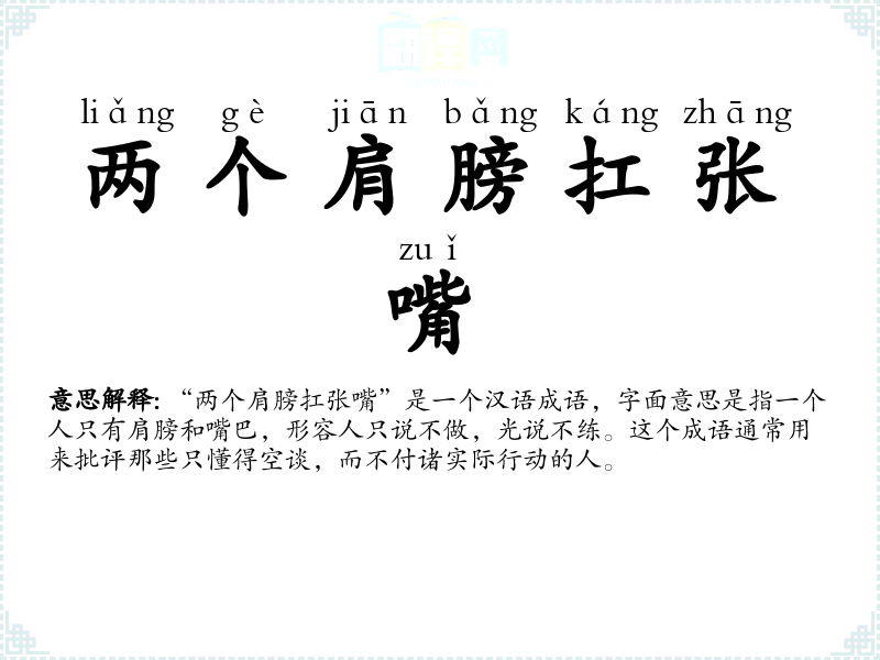 “两个肩膀扛张嘴”是一个汉语成语,字面意思是指一个人只有肩膀和嘴巴,形容人只说不做,光说不练。这个成语通常用来批评那些只懂得空谈,而不付诸实际行动的人。