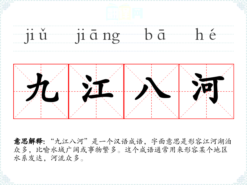 “九江八河”是一个汉语成语,字面意思是形容江河湖泊众多,比喻水域广阔或事物繁多。这个成语通常用来形容某个地区水系发达,河流众多。