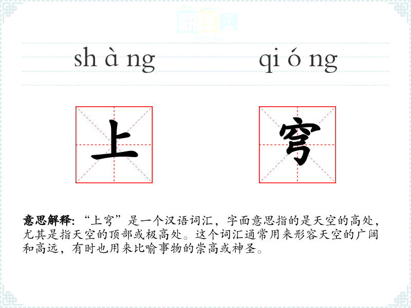 在英语中,与“上穹”相对应的词汇可能是“the vault of heaven”或“the celestial sphere”,这些词汇在英语文学和诗歌中也有类似的用法和象征意义。