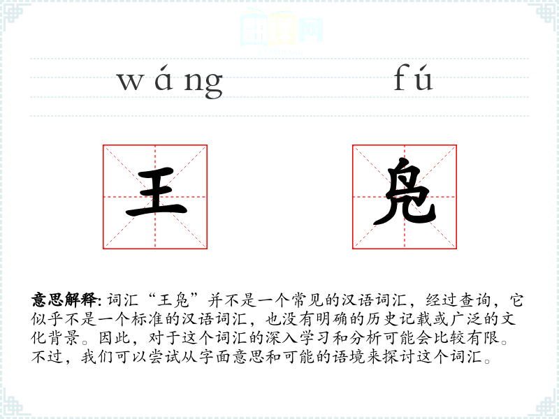 词汇“王凫”并不是一个常见的汉语词汇,经过查询,它似乎不是一个标准的汉语词汇,也没有明确的历史记载或广泛的文化背景。因此,对于这个词汇的深入学习和分析可能会比较有限。不过,我们可以尝试从字面意思和可能的语境来探讨这个词汇。