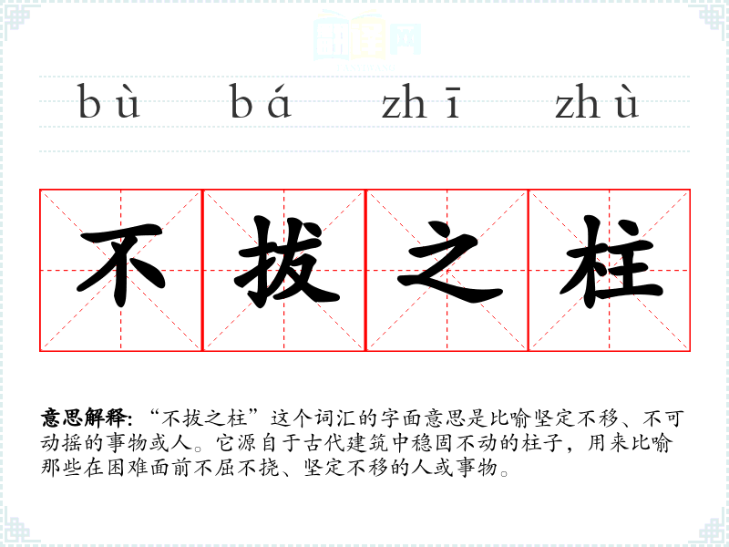 “不拔之柱”这个词汇的字面意思是比喻坚定不移、不可动摇的事物或人。它源自于古代建筑中稳固不动的柱子,用来比喻那些在困难面前不屈不挠、坚定不移的人或事物。