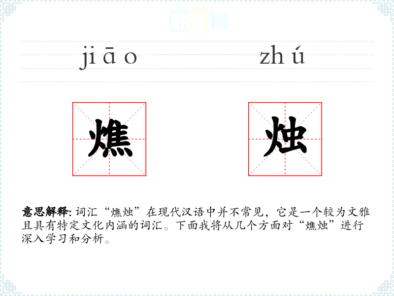 词汇“燋烛”在现代汉语中并不常见,它是一个较为文雅且具有特定文化内涵的词汇。下面我将从几个方面对“燋烛”进行深入学*和分析。