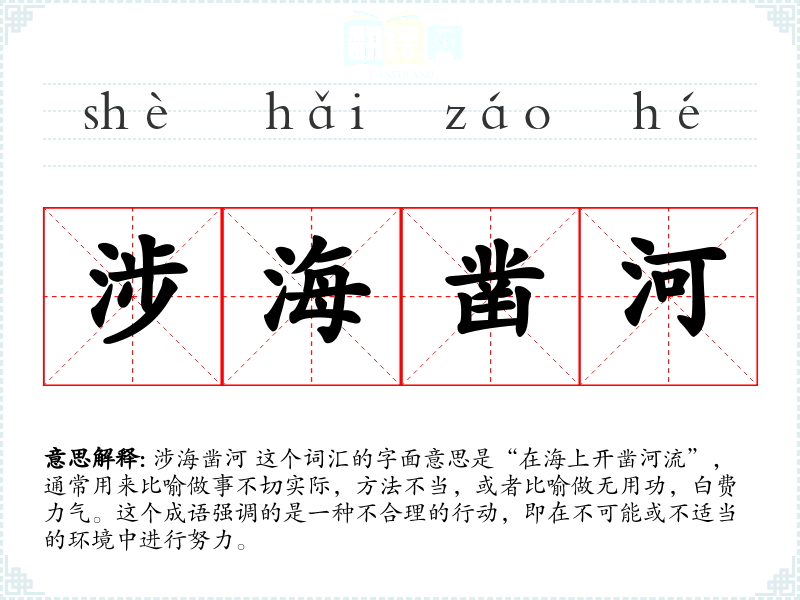 涉海凿河 这个词汇的字面意思是“在海上开凿河流”,通常用来比喻做事不切实际,方法不当,或者比喻做无用功,白费力气。这个成语强调的是一种不合理的行动,即在不可能或不适当的环境中进行努力。