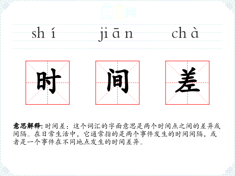 时间差:这个词汇的字面意思是两个时间点之间的差异或间隔。在日常生活中,它通常指的是两个发生的时间间隔,或者是一个在不同地点发生的时间差异。