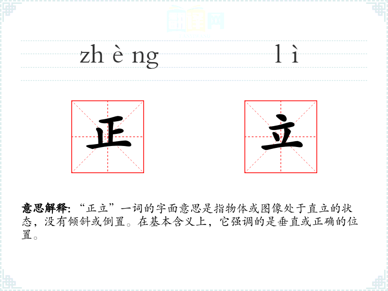 “正立”一词的字面意思是指物体或图像处于直立的状态,没有倾斜或倒置。在基本含义上,它强调的是垂直或正确的位置。