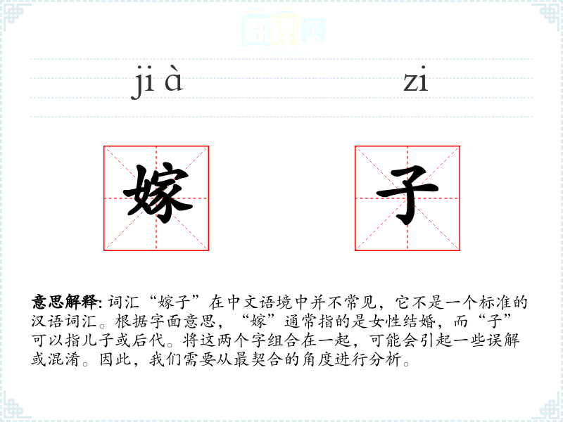 词汇“嫁子”在中文语境中并不常见,它不是一个标准的汉语词汇。根据字面意思,“嫁”通常指的是女性结婚,而“子”可以指儿子或后代。将这两个字组合在一起,可能会引起一些误解或混淆。因此,我们需要从最契合的角度进行分析。