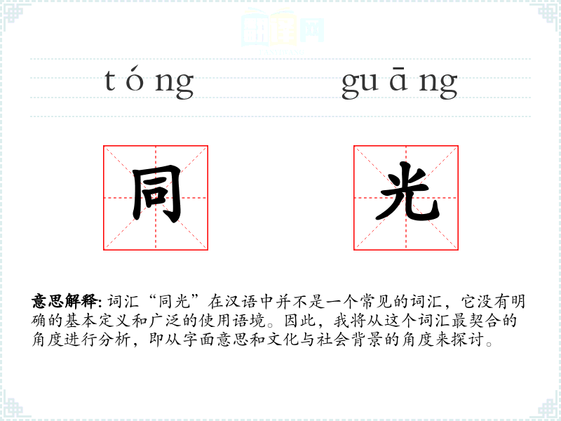 词汇“同光”在汉语中并不是一个常见的词汇,它没有明确的基本定义和广泛的使用语境。因此,我将从这个词汇最契合的角度进行分析,即从字面意思和文化与社会背景的角度来探讨。