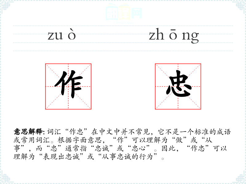“作忠”这个词虽然不常见,但它强调了忠诚的行为和态度,是一个值得在特定语境中使用的词汇。在学*和表达中,了解和正确使用这样的词汇可以丰富语言表达的层次和深度。