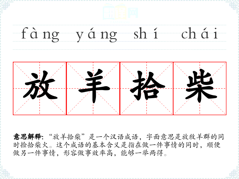 “放羊拾柴”是一个汉语成语,字面意思是放牧羊群的同时捡拾柴火。这个成语的基本含义是指在做一件事情的同时,顺便做另一件事情,形容做事效率高,能够一举两得。