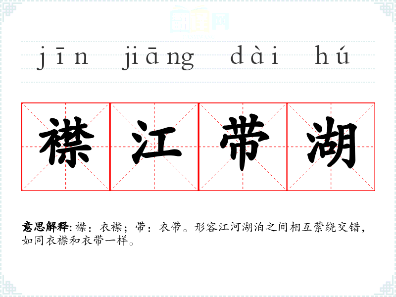 襟:衣襟;带:衣带。形容江河湖泊之间相互萦绕交错,如同衣襟和衣带一样。