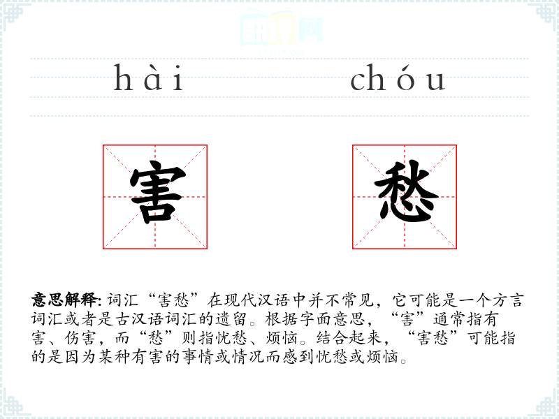 “害愁”可能是由“害”和“愁”两个字组合而成的复合词。在古代汉语中,“害”有伤害、损害的意思,“愁”则一直指忧愁。这个词可能在某些方言中保留了其古汉语的用法。