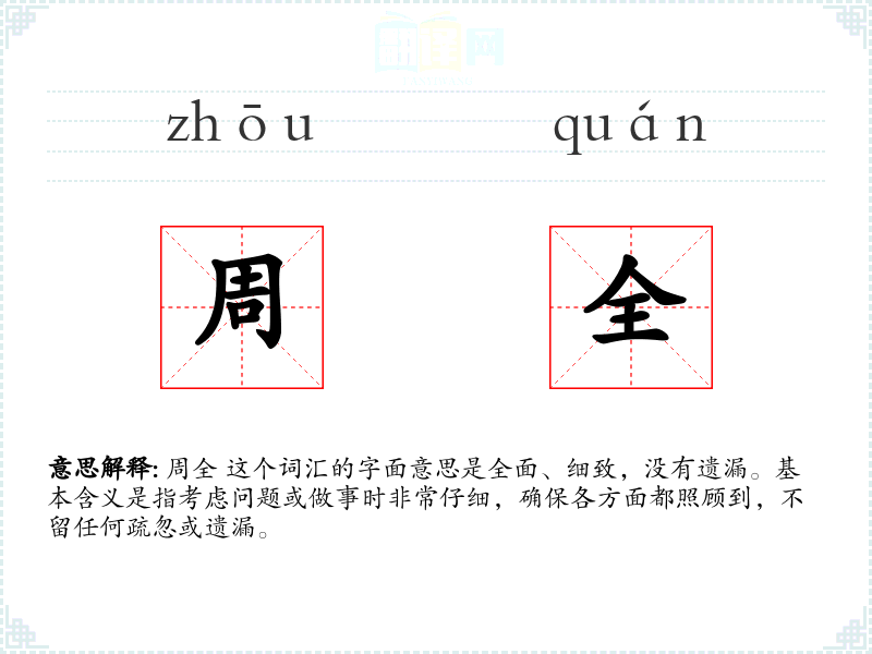 周全 这个词汇的字面意思是全面、细致,没有遗漏。基本含义是指考虑问题或做事时非常仔细,确保各方面都照顾到,不留任何疏忽或遗漏。